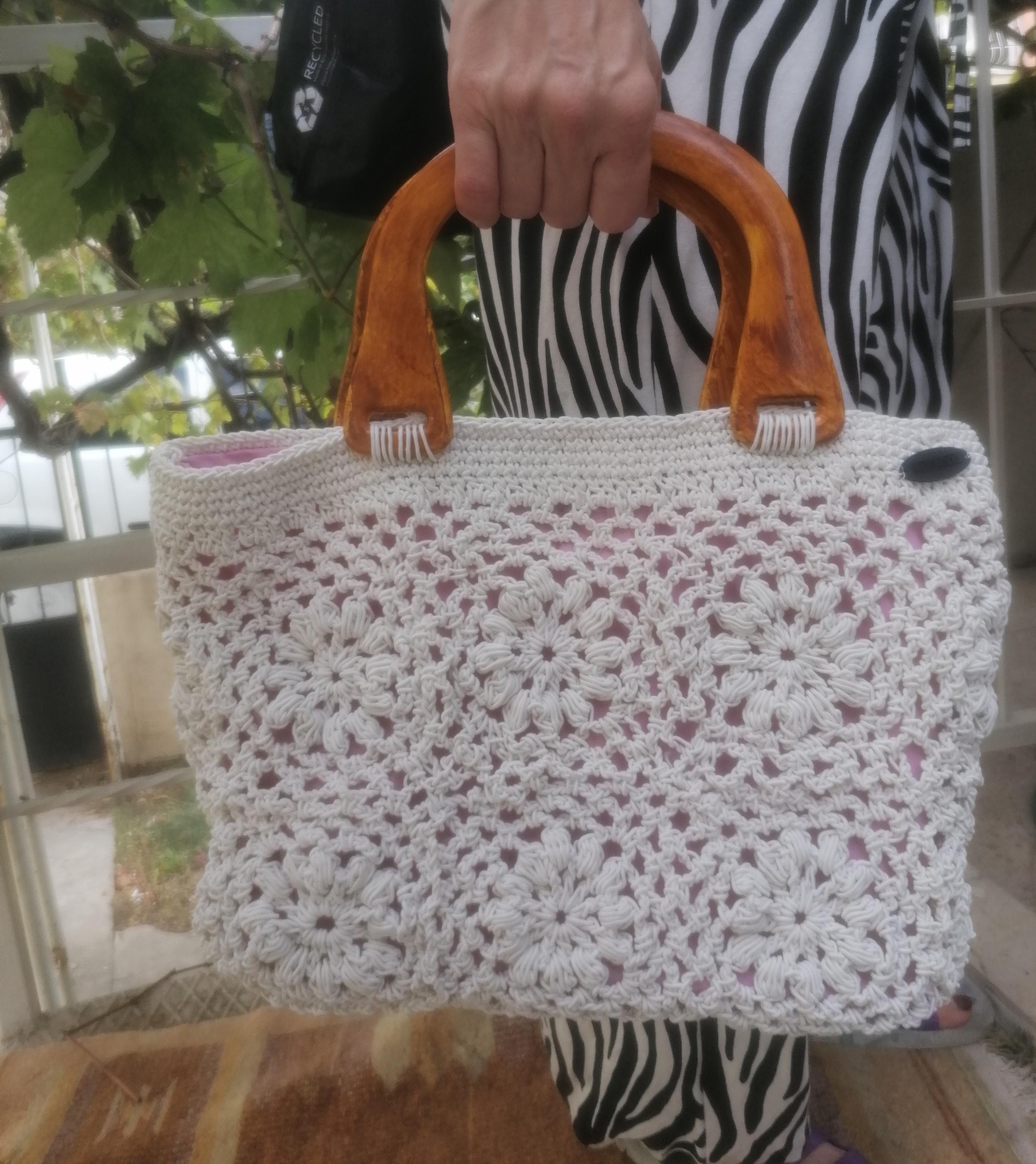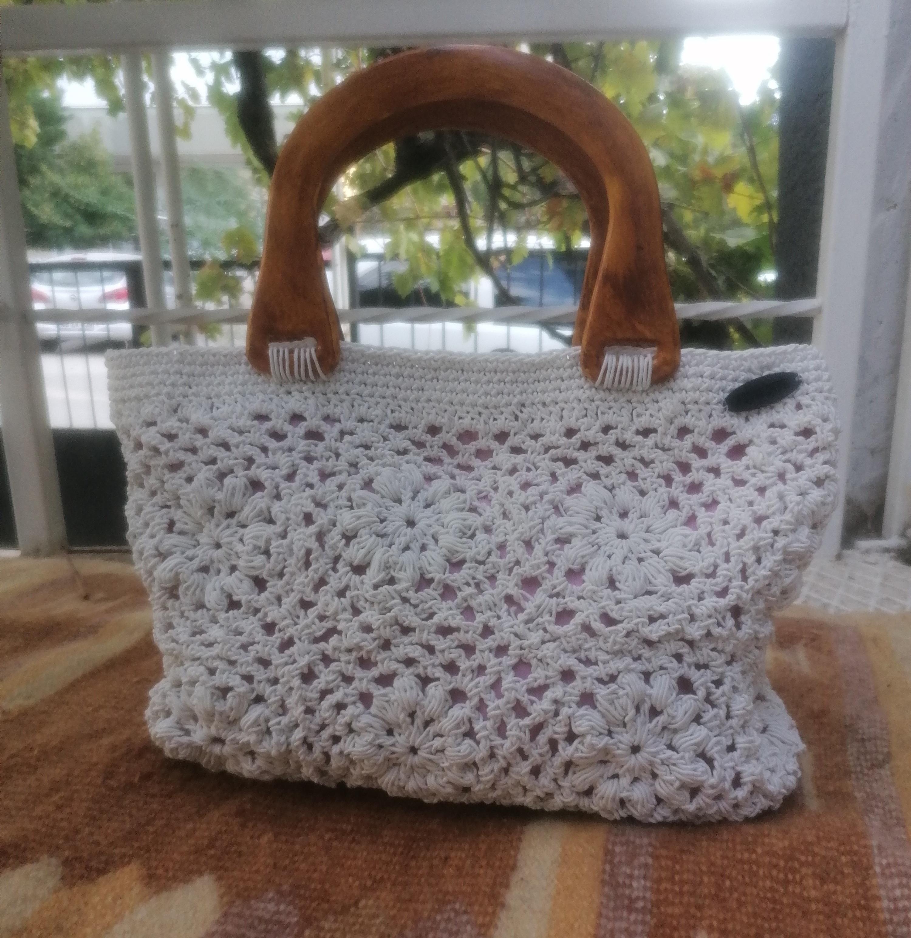 El örgüsü şık astarlı ahşap saplı el çantası