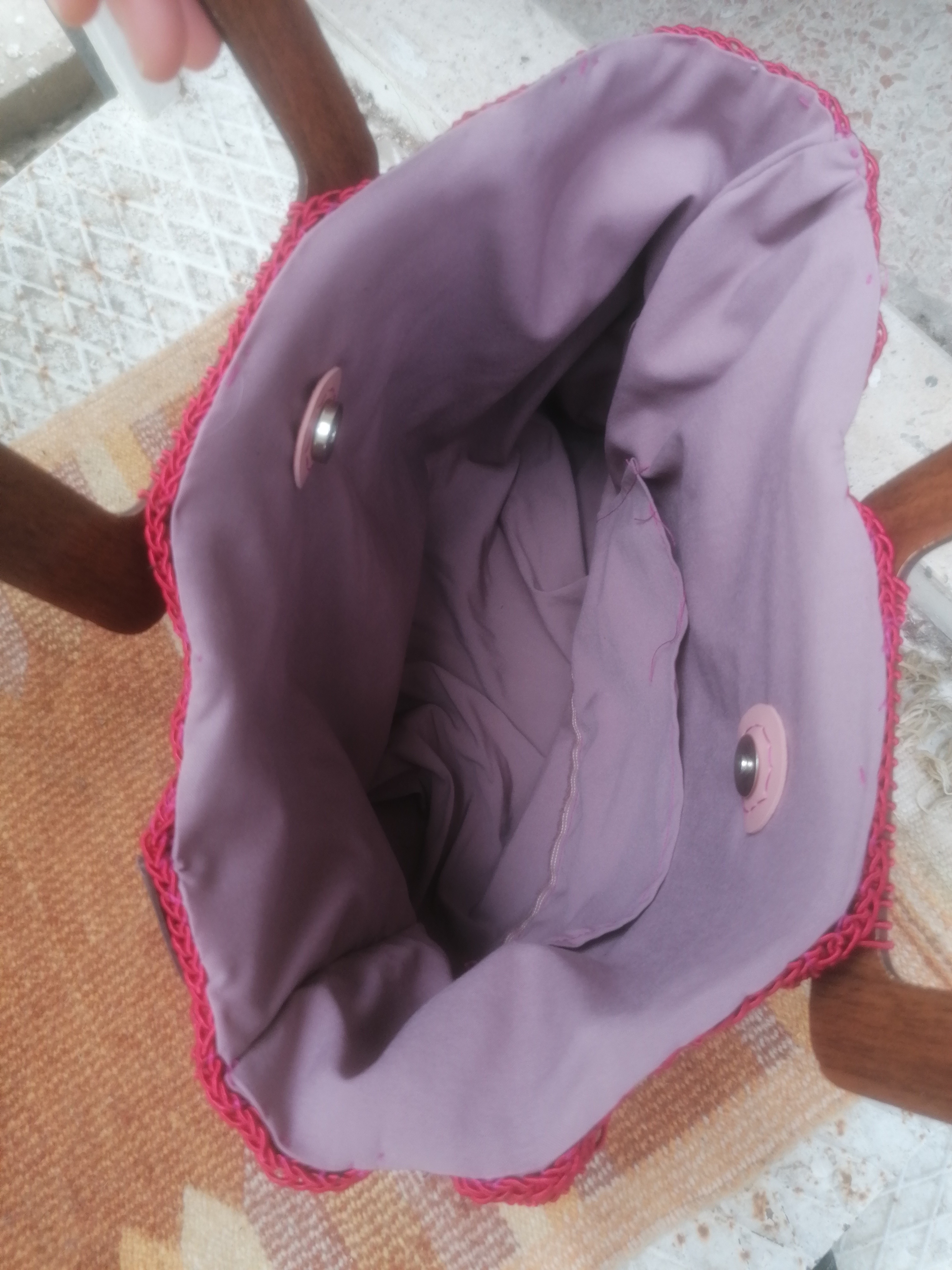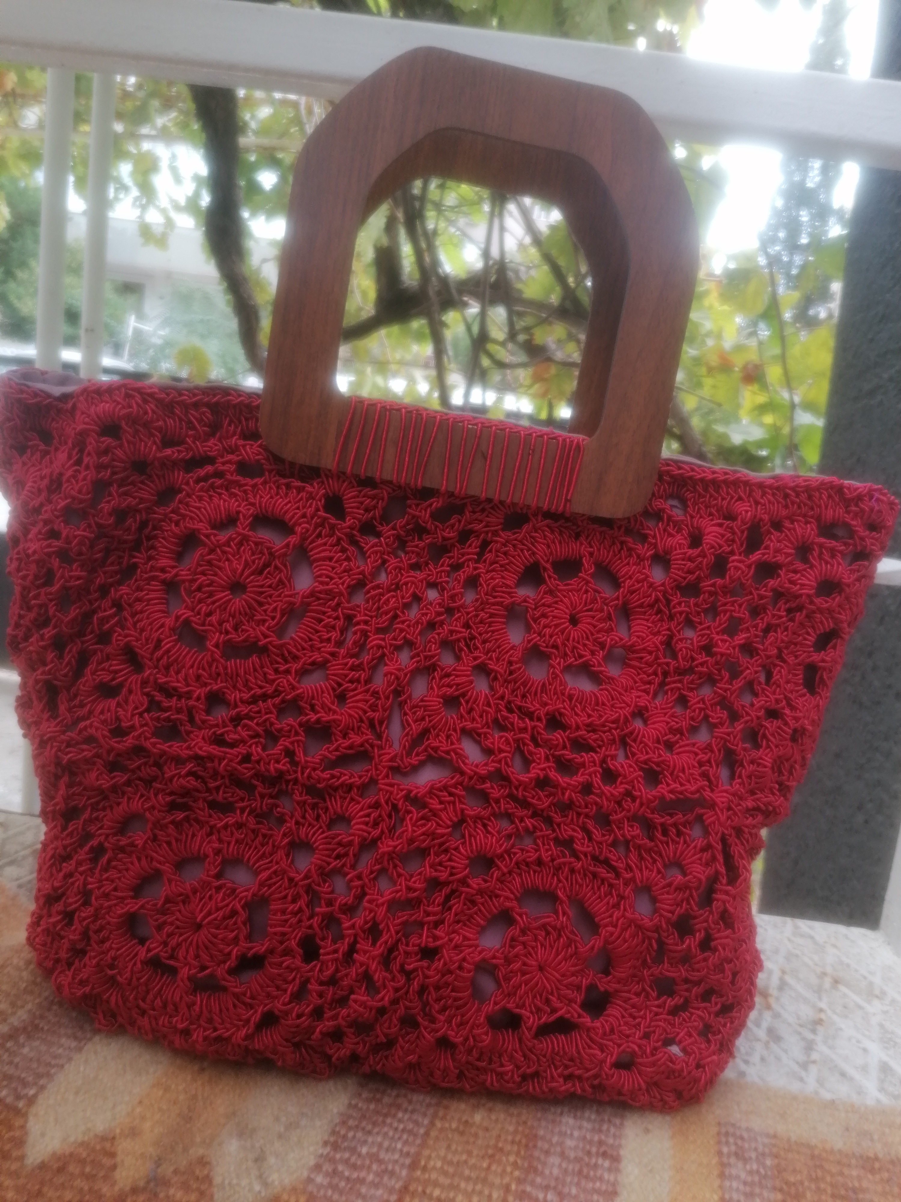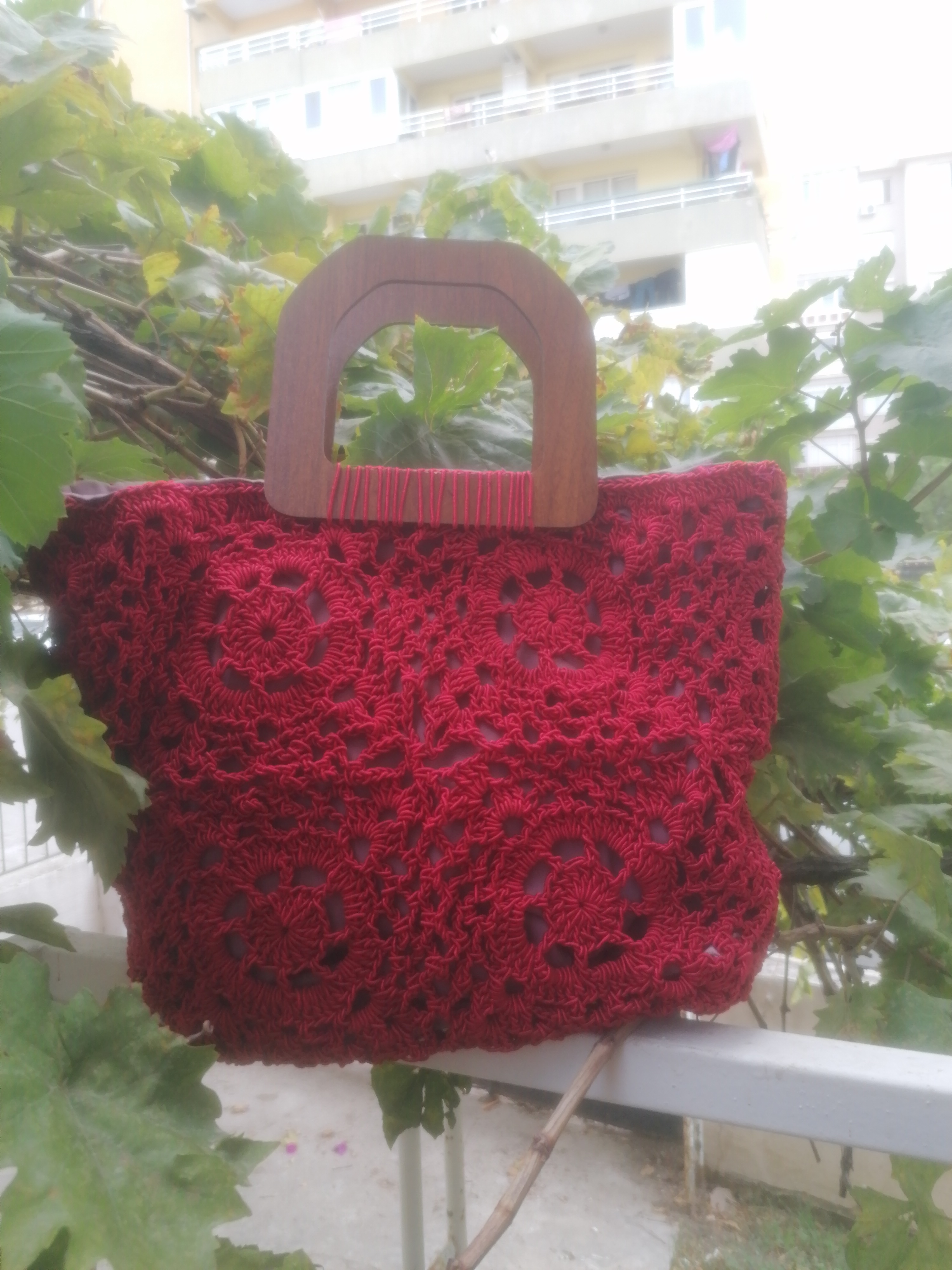 Kırmızı renkli ahşap saplı el örgüsü çanta.